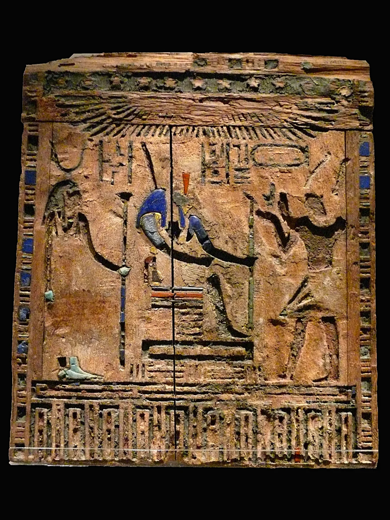 Egyptian representation of Darius the Great of Persia as a pharaoh. Wooden naos door: inlaid with polychrome glass (fragments of which survive - light-blue; dark-blue; red).
