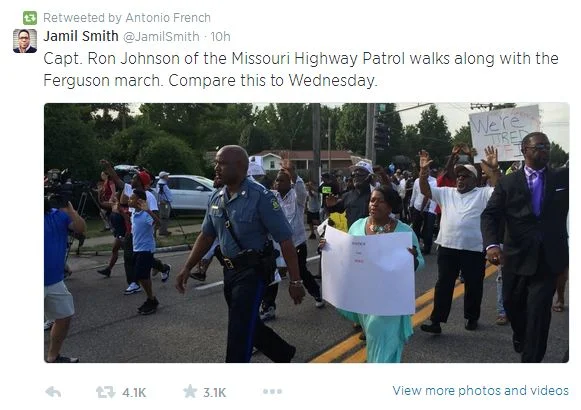 yesterday afternoon—thursday, august 14th—ferguson & stl police were taken out of control of ferguson and replaced with MO highway patrol, led by captain ron johnson, who grew up in the area. his first order of business was to order police to remove their masks and cease violent tactics.