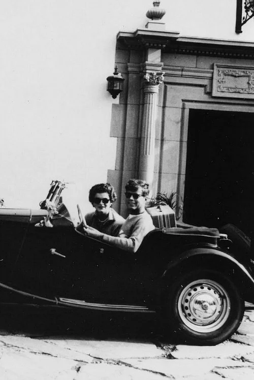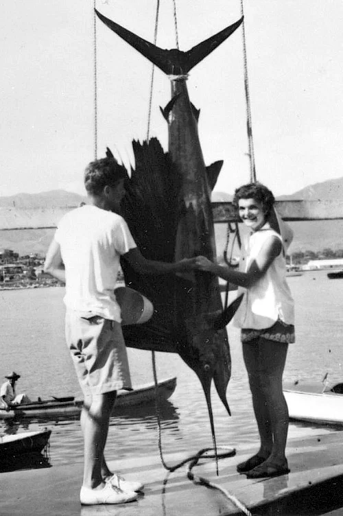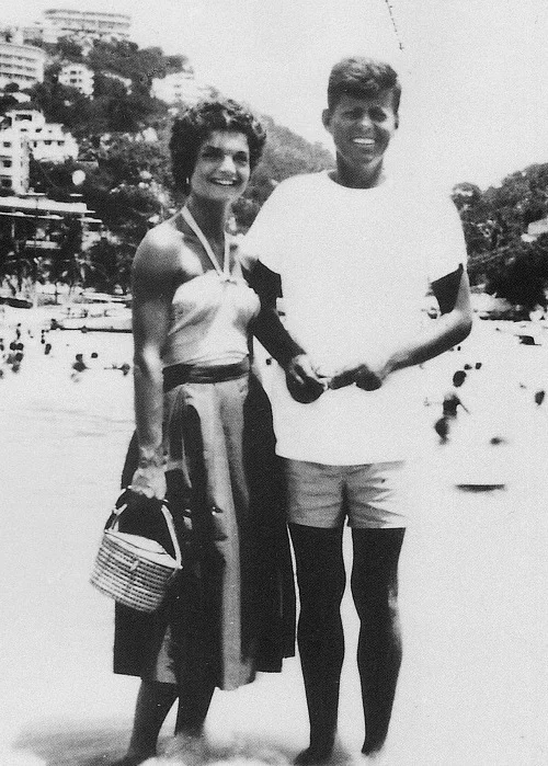 Jack and Jackie on their honeymoon, September 1953. After the wedding, the newlyweds flew from Newport to NYC, where they spent their wedding night in the Waldorf-Astoria hotel. They flew to Mexico the next day, to Acapulco, where they stayed in a pink stone villa above the Pacific Ocean, lent to them by the President of Mexico. They posed on the beach a few days later. Jackie once told and interviewer about a highlight of their honeymoon: “My husband caught a ten-foot fish…I was in the boat but all I did was pour water on him. It was so hot in that boiling sun and he had to fight the fish for about three hours, so I stood there pouring water on him.” The sailfish later hung in the White House, in the appropriately named Fish Room. These photos come from Jackie’s wedding scrapbook.