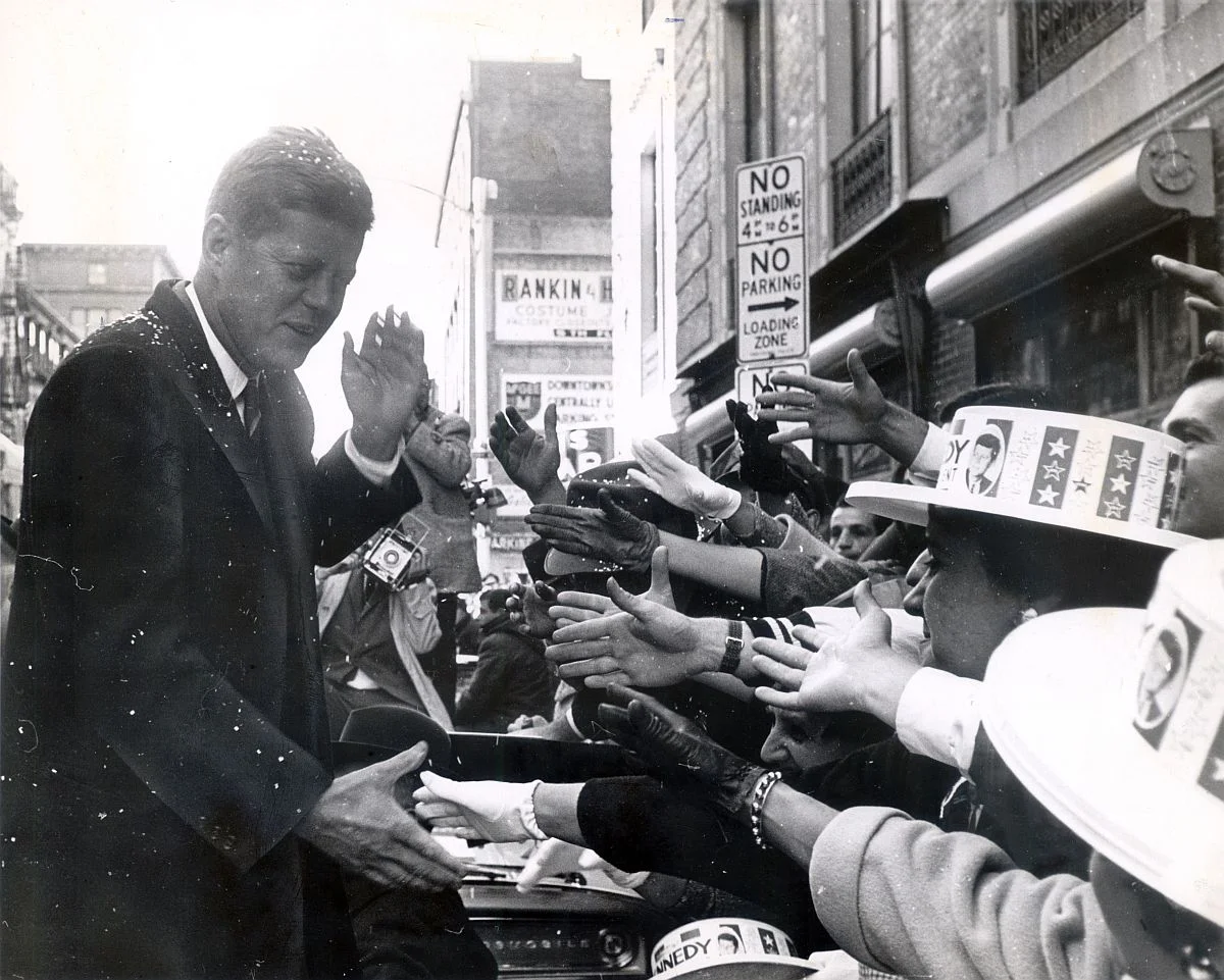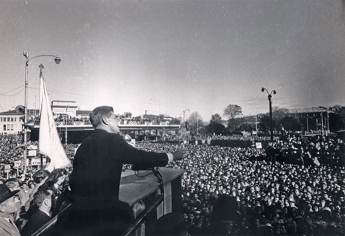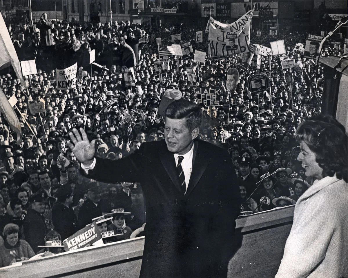 Sen. John F. Kennedy (D-Mass.) after spoke from the steps of Providence City Hall on Nov. 7, 1960, the day before his election as President, to a huge crowd in Exchange Place, which was renamed Kennedy Plaza after his assasination in 1963. He was accompanied by his sister Patricia Lawford.
