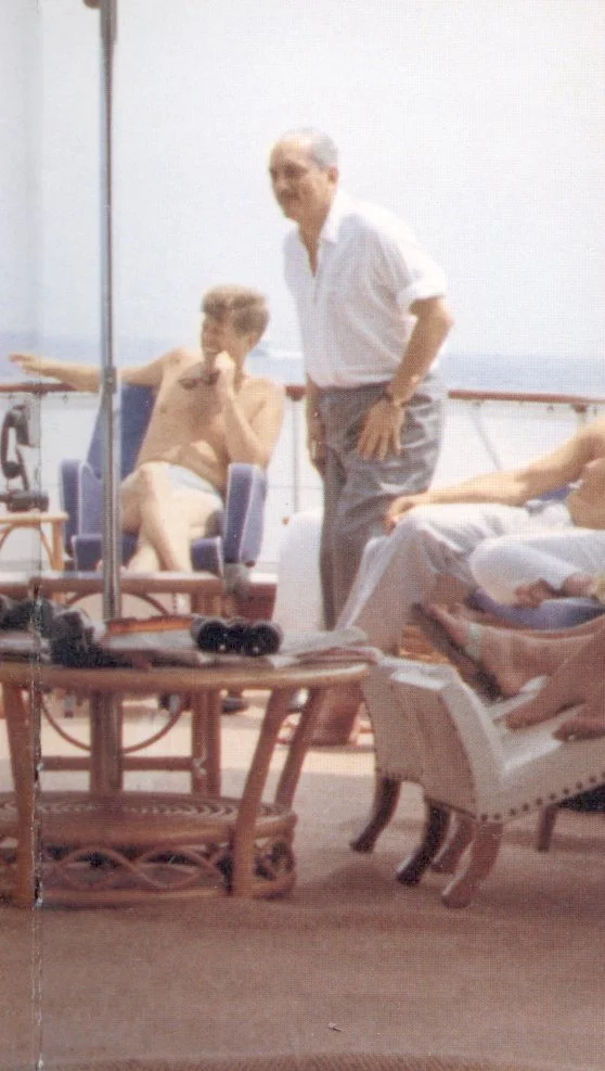 john-f-kennedy-and-his-family: Jack aboard the Honey Fitz. I think the old guy standing is Lee’s husband Stas. jihad peoplesFebruary 4, 2013Comment Twitter Tumblr 0 Likes