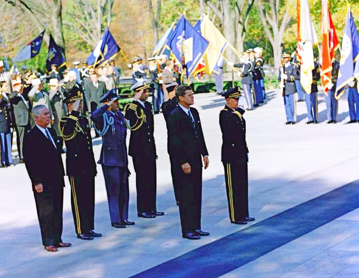 President Kennedy observes the Veteran’s Day ceremonies at the Arlington National Cemetery, November 11, 1963. At the end of the ceremony he is joined by his son, John F. Kennedy Jr. Thirteen days later President Kennedy would be laid to rest at the very same cemetery.
