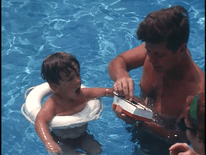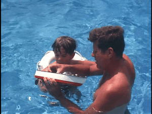 President Kennedy experiencing what every parent goes through with battery-operated childrens toys.
