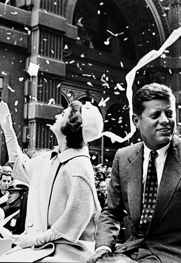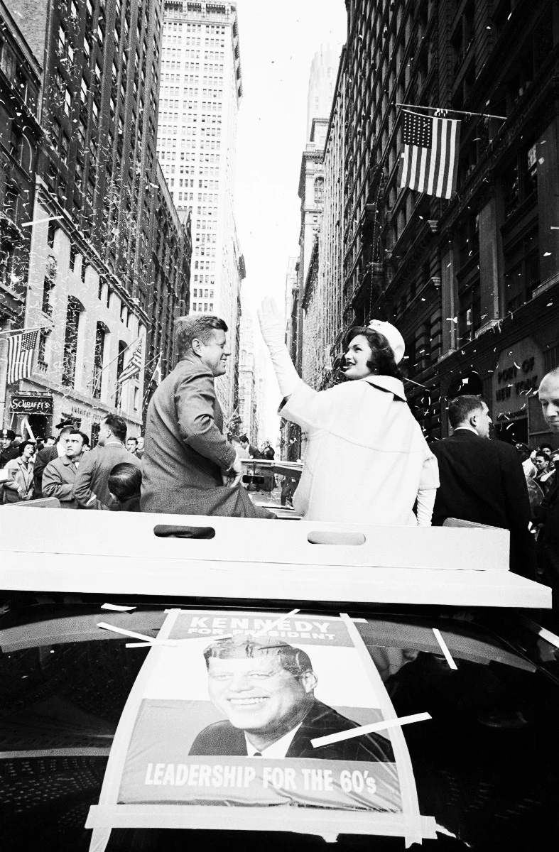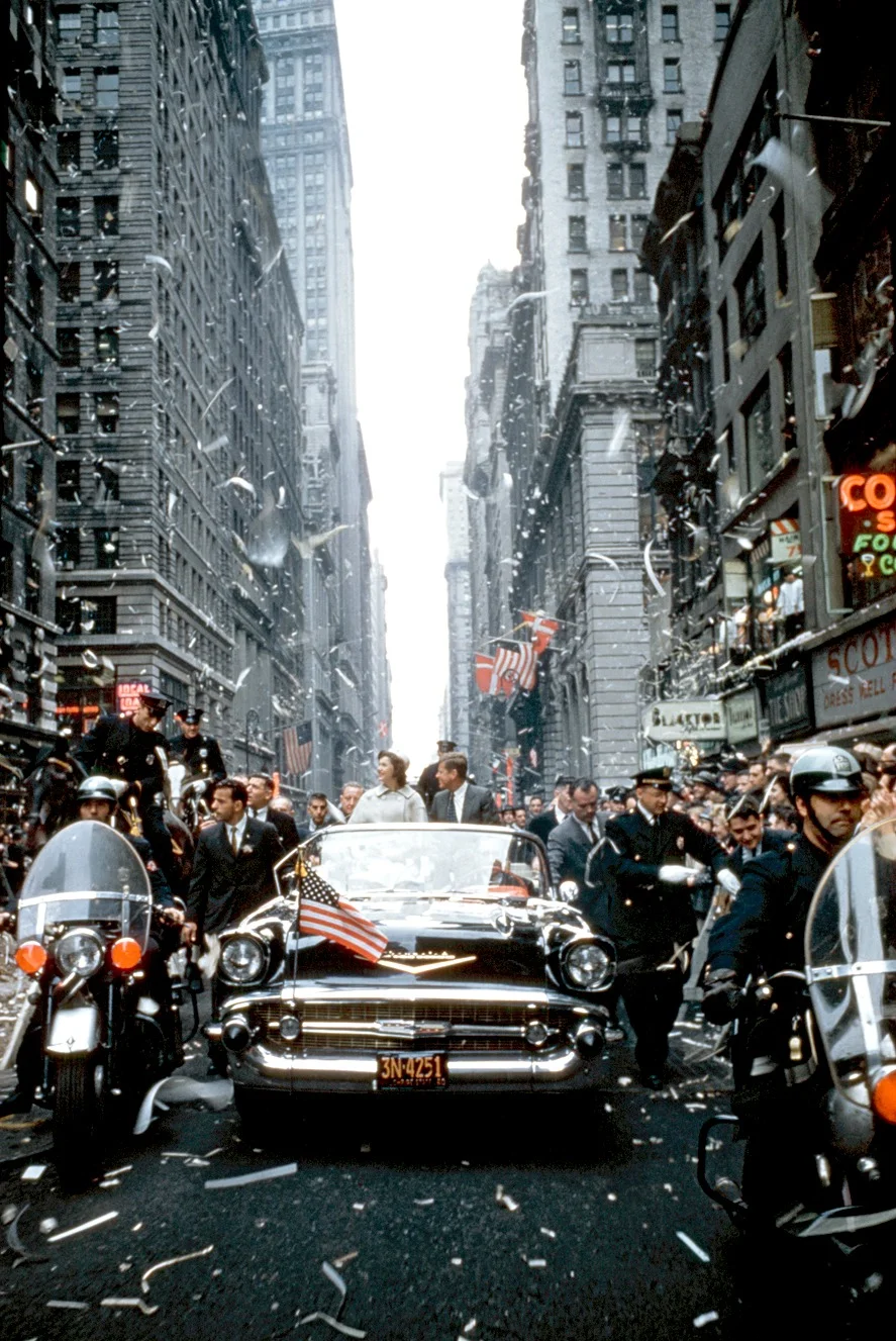 October 19th, 1960. When Jack and Jackie climbed into their convertible for the parade, rain seemed imminent. But according to an enthusiastic report in the next day’s New York Times, “just as he was about to start up Broadway from Whitewall Street, the sun shone as if a switch had been turned on.” By the time the motorcade reached Wall Street, the crush of the crowd was so intense that Jackie told a reporter, “It felt like the sides of the car were bending.” According to Mayer Robert Wagner Jr., the turnout for Kennedy’s ticker-tape parade was “the greatest reception anybody has ever received in this section of the city in its history.”AKA: Kennedy weather