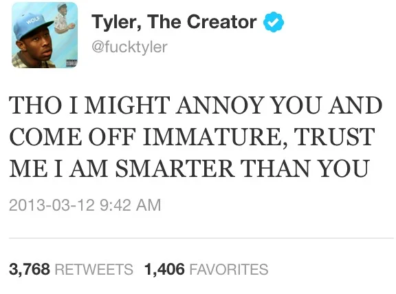 lolsofunny: theblacksouls: tyler the creator explaining my life in under 140 characters lmao jihad peoplesMarch 26, 2013Comment Twitter Tumblr 0 Likes