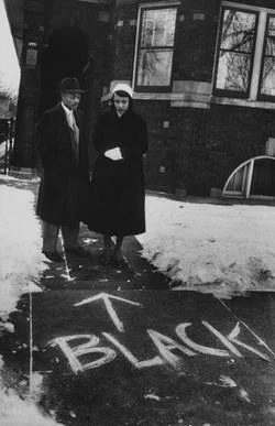 A couple who moved into an all-white neighborhood in Chicago looking at graffiti in front of their home. Photograph by Francis Miller. Chicago, Illinois, USA, 1957.