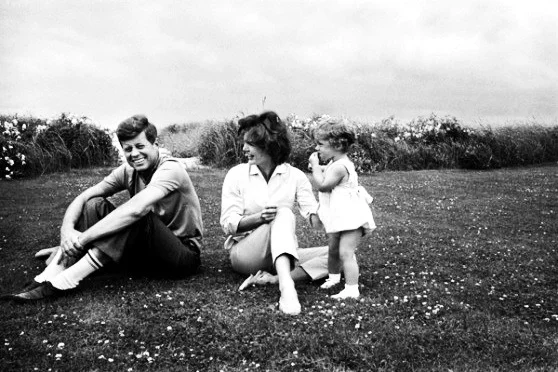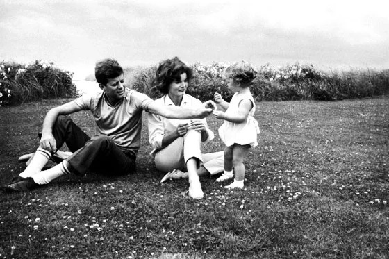 Jack, Jackie, and Caroline share a candid moment on the lawn, 1959