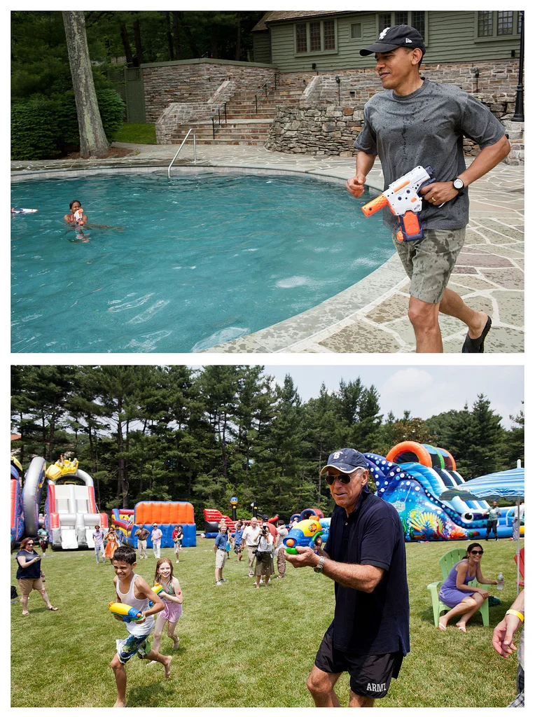 June 11, 2011 “The top photograph shows the President having a water gun fight with his daughter Sasha on her birthday weekend at Camp David. Unbeknownst to me, David Lienemann captured a similar photo of the Vice President on the very same day.” (Official White House Photos by Pete Souza and David Lienemann)