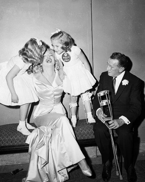 On January 28, 1958 Marilyn attended the 14th annual March of Dimes fashion show at the Waldorf-Astoria in New York City, with poster child Sandra and Linda Solomon. March of Dimes was established by president Franklin D. Roosevelt to fight polio, once that was achieved the focus shifted to premature birth and birth defects.