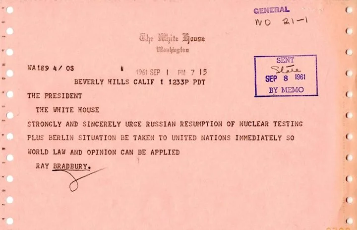 Fahrenheit 451 author Ray Bradbury penned this telegram to President Kennedy urging him to take the Soviet Union’s actions related to nuclear weapons and Berlin before the UN. Since its publication, Fahrenheit 451 has been censored or banned by hundreds of school districts and parents nationwide.