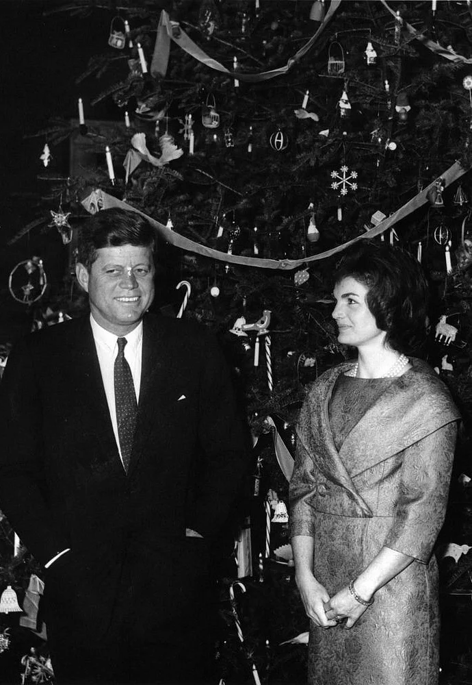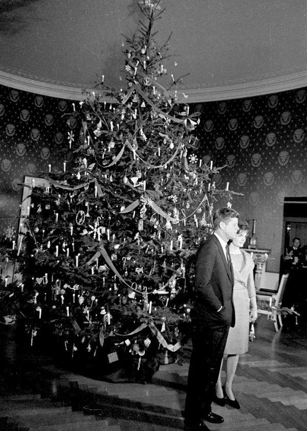 President and Mrs. Kennedy pose in front of the White House Christmas tree, 1960s.