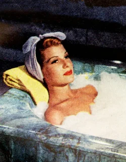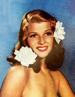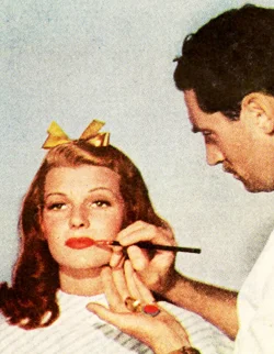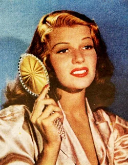 Rita Hayworth in an advertisement that emphasizes the importance of glamour when working in a munitions factory, 1941.