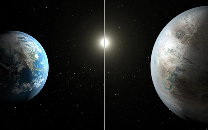 Nasa has found a twin Earth orbiting a star like the Sun in the Milky Way. Kepler 452b - which has been dubbed Earth 2.0 - is six billion years old, has a 385 day year and orbits its star at the same distance as us. It is 1,400 light-years away in the constellation Cygnus. This image compares Earth, left, to Kepler-452b, which is about 60 percent larger.