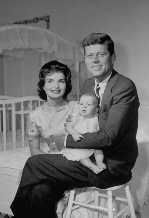Senator John F. Kennedy with wife Jacqueline, holding their new baby Caroline in her nursery at their Georgetown home, 1958.