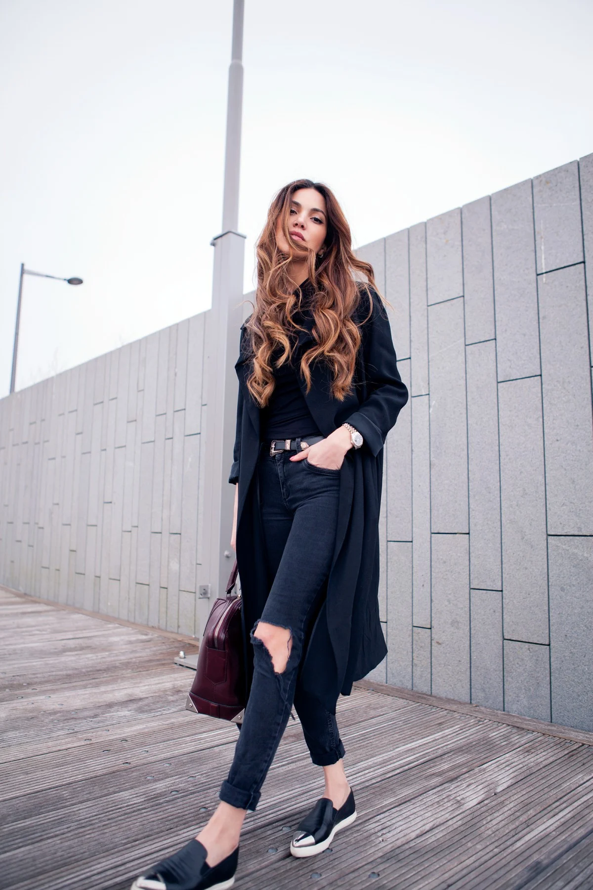 Via Just The Design: Negin Mirsalehi is wearing an oversized black coat with River Island skinny jeans and a pair of black Miu Miu pumps