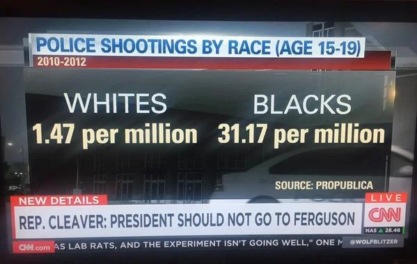 zubat: Cop shootings by race/per million: 1.47 white people vs 31.17 black people. And people really want to believe that the outrage is simply over one murdered black teenager. jihad peoplesDecember 3, 2014Comment Twitter Tumblr 0 Likes